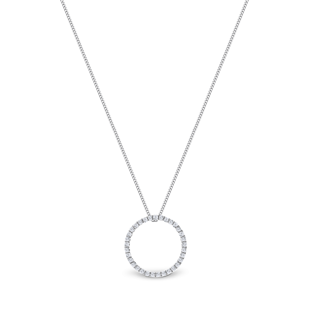 The Nova Pendant features a perfectly balanced circular motif, meticulously set with round brilliant-cut diamonds in luminous 18ct white gold. Available in a variety of carat weights, this modern yet timeless diamond necklace is designed to capture light from every angle, an elegant symbol of wholeness and harmony.