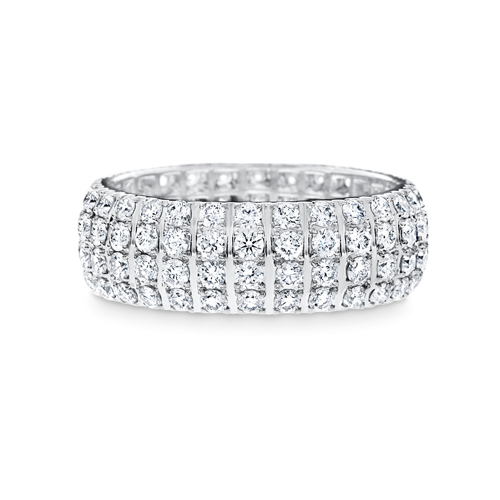 The Peyton Ring features four rows of round brilliant cut diamonds, expertly set in polished white gold. Its sleek, contoured silhouette offers a refined sparkle and bold presence, ideal as a luxury dress ring or striking anniversary band. Available in various diamond carat weights to suit your style.