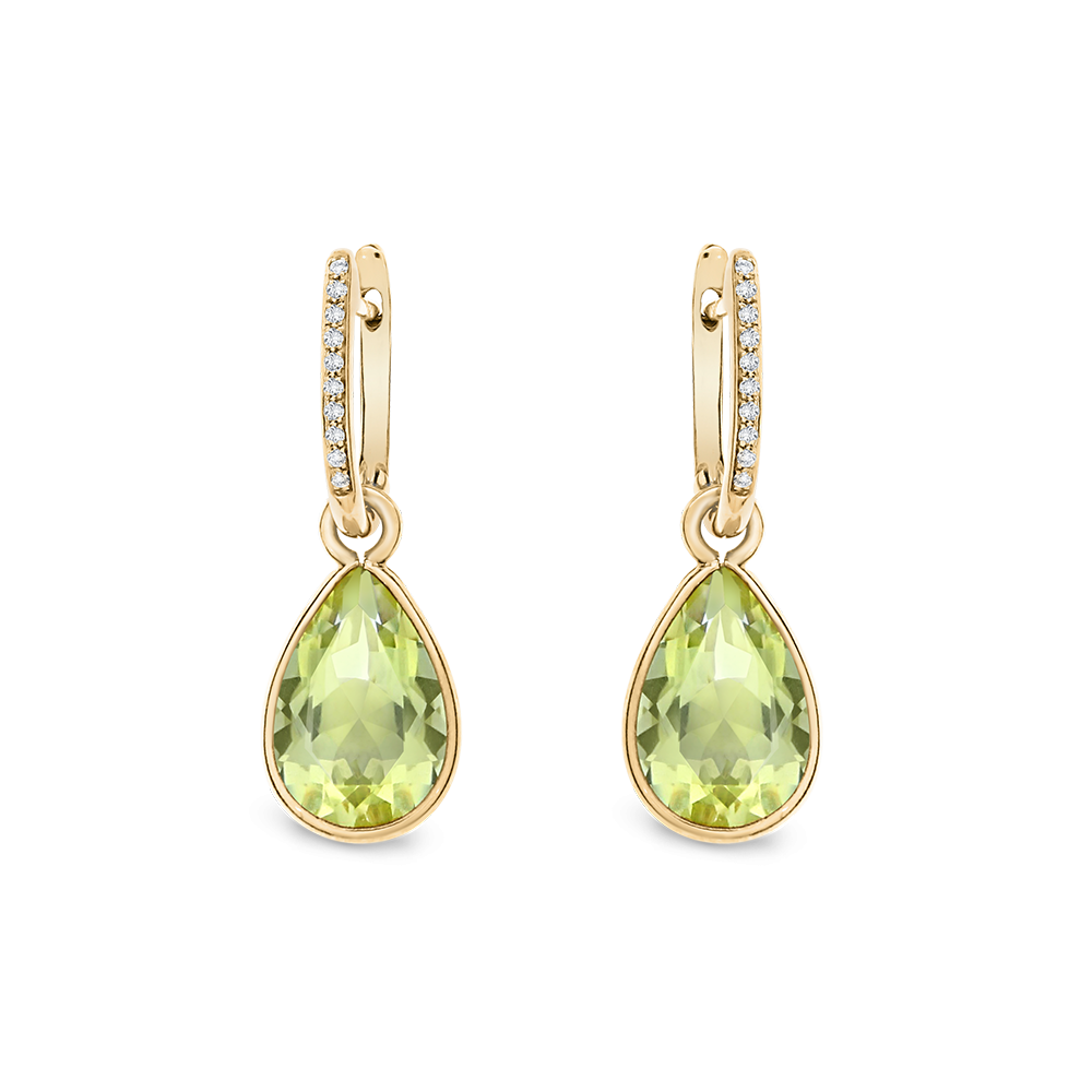 These 18ct yellow gold drop earrings feature pear-cut quartz gemstones and a clasp adorned with round brilliant-cut diamonds. All gemstones are hand-selected for optimal quality and brilliance. Set with 20 diamonds totalling 0.16ct.