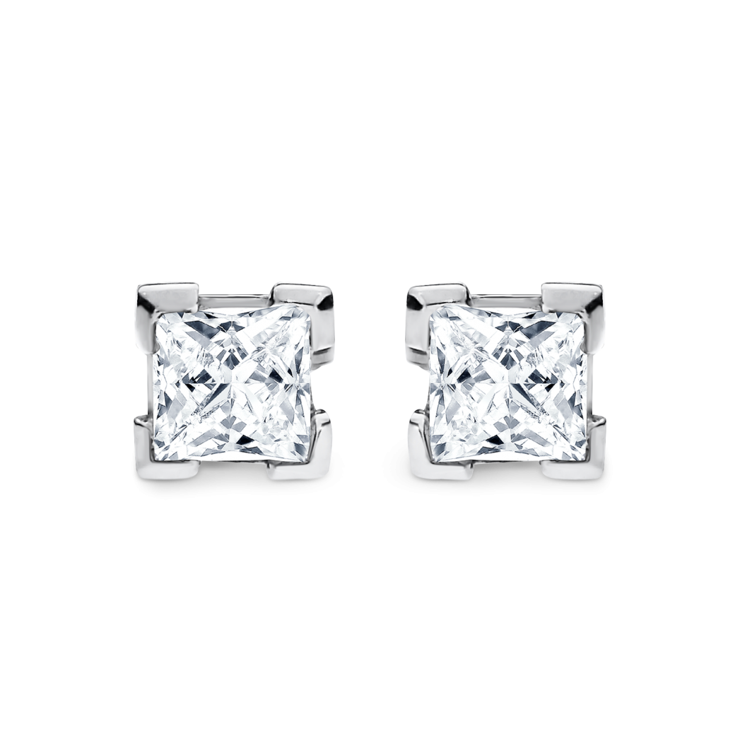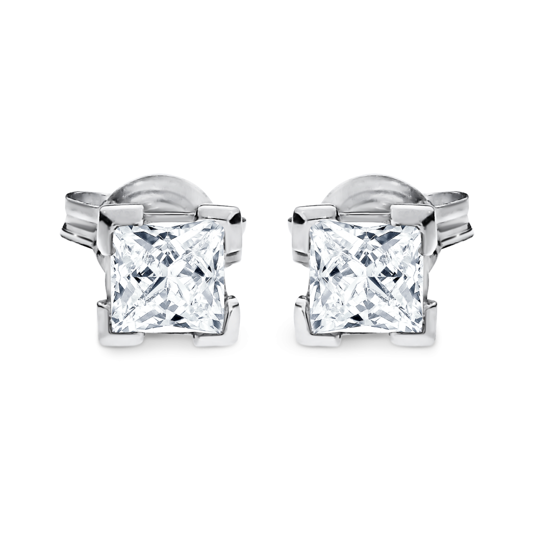 White gold earrings featuring princess-cut diamonds are enhanced with picture frame claws allowing light to shine through the diamonds for a brilliant look. ADC specializes in custom-made diamond earrings of various diamond shapes and carat weights.